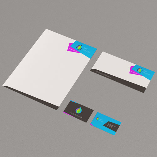 The letterheads and compliment slips are printed full colour on one side on 120gsm uncoated paper, and the business cards are printed full colour on one side on 450gsm silk card - everything a small or new business will need.
