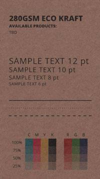 Our 235gsm or 300gsm Kraft stock looks like a classic brown paper bag. It has a coarse texture and a beautifully rustic feel. Colour reproduction is impacted by not being bright white, but if you design accordingly, it looks incredible.